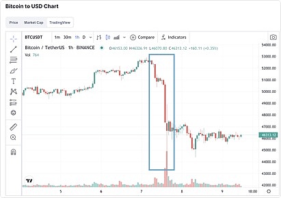 该消息公布后,比特币价格一路飙升,至52681.85美元,创下5月以来最高水平。但好景不长,比特币出现闪崩。