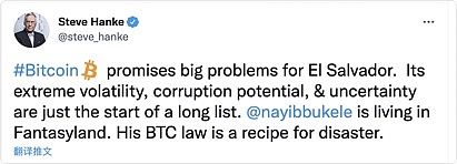 “Nayib Bukele(萨尔瓦多总统)住在幻想乡里,他的 BTC 法是灾难的秘诀。”Steve Hanke在推特上写到。