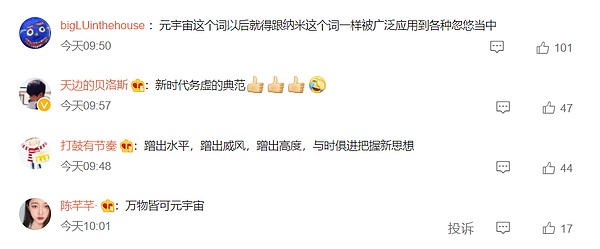消息发布后,有网友质疑张家界在蹭元宇宙热点:“蹭出水平,蹭出威风,蹭出高度。”还有网友评价张家界是新时代务虚的典范:“万物皆可元宇宙。”