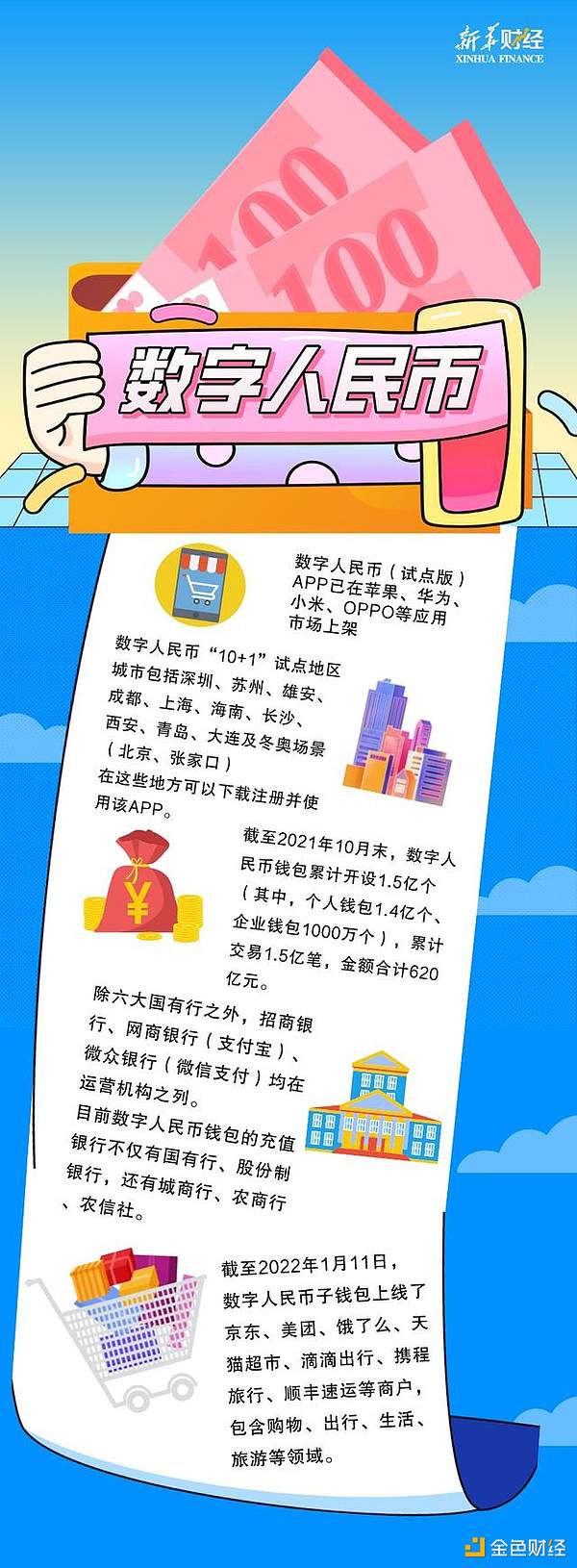 基于我国央行发行的数字货币(即数字人民币)是零售型央行数字货币,面向公众发行并用于日常交易,对零售场景的探索成为我国数字人民币试点过程中的重要方向。央行数据显示,截至2021年10月末,数字人民币钱包累计开设1.5亿个(其中,个人钱包1.4亿个、企业钱包1000万个),累计交易1.5亿笔,金额合计620亿元。有155万商户支持数字人民币钱包,涵盖公共事业、餐饮服务、交通出行、购物和政务等各个领域。