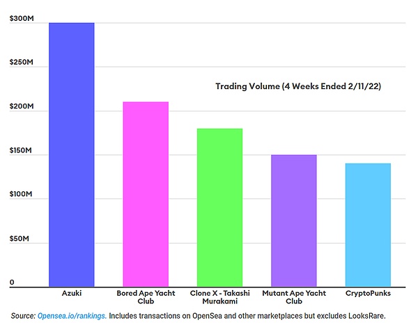 截至到2月11日的四周内,Azuki在诸如OpenSea的几个主要NFT交易市场上达到了近3亿美元的交易量。最昂贵的Azuki现在的交易价格是50万美元;比较便宜的能以36000美元的价格认购。