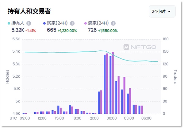 根据NFTGo同一时间的数据,在过去的24小时里,Azuki系列NFT的交易量增长了1129%,其中买家有665人,卖家有726人,这导致Azuki持有人数下降了1.41%。在这段时间里,该NFT系列经历了近一个月以来的最多换手。