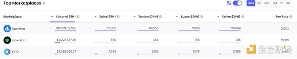 作为比较,OpenSea, LooksRare 和 x2y2 在过去 24 小时内分别完成了大约 8,000 ETH, 2,100 ETH 和 1,000 ETH 的交易 ( 虚拟交易已被排除 ):