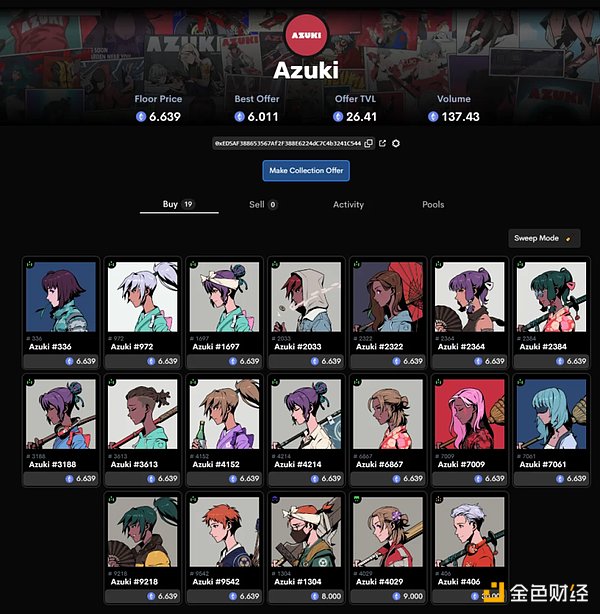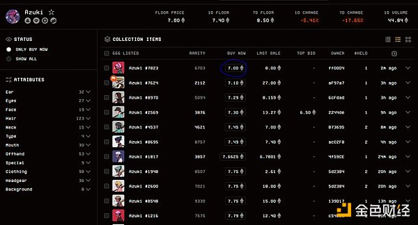 这是一个例子。现在如果我想买一个 Azuki,通过 OpenSea, LooksRare 和 x2y2 的最低价格是 7 ETH,并且在这个价格下只有一个选择。