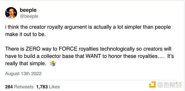 首先,我想说的是,创作者版税是我们整个空间建立的基石之一。对艺术家来说尤其如此。我们必须为巩固这种文化而奋斗。这里的关键词是文化。在智能合约层面,版税是不可强制执行的 ( 我们将很快讨论这个问题 )。为了支付创作者版税,人们必须愿意支付。