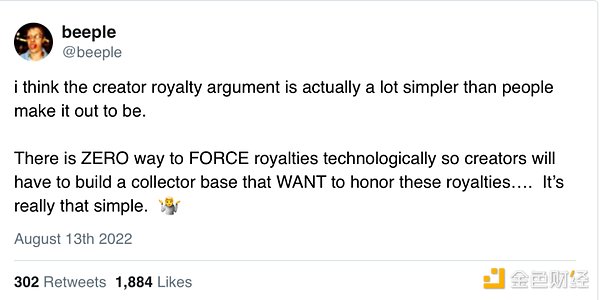 我还想说的是,这其中有大量的细微差别。不是所有的创造者都是平等的。我知道一旦我们开始讨论这些事情,它就会变成一个难以置信的滑坡,但在我看来,我们已经在这个滑坡上了,现在忽略它是不成熟的。一个 1/1 的艺术家和一个发布 10k pfp 项目的团队是不一样的,他们有一个路线图,有一个高的铸币价格,这和一个有 VC 支持的项目也是不一样的。这些划分是否会影响市场支付版税的决定是一回事。事实是,它已经影响了市场的决定。