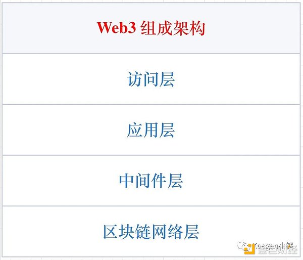 Web3 发展至今,生态已然初具雏形,如果将当前阶段的 Web3 生态组成架构抽象出一个鸟瞰图,由下而上可划分为四个层级:区块链网络层、中间件层、应用层、访问层。下面我们来具体看看每一层级都有什么。另外,此章节会涉及到很多项目的名称,因为篇幅原因不会一一进行介绍,有兴趣的可以另外去查阅相关资料进行深入了解。