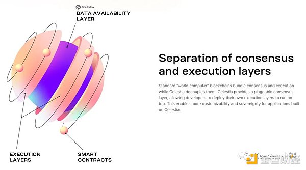 Layer0 则比较抽象了,一般被定义为区块链基础设施服务层,主要由模块化区块链所构成,包括 Celestia、Polkadot、Cosmos 等。模块化区块链这个概念主要是由 Celestia 提出的,其核心设计思路就是把区块链的共识、执行、数据可用性这几个核心模块拆分开来,每个模块由一条单独的链来完成,再将几个模块组合到一起完成全部工作。这和软件架构设计中所提倡的模块化设计思想是一样的,可实现高内聚低耦合。
