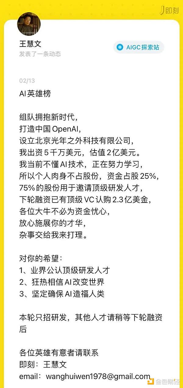 两天前,手握5000万美元的美团联合创始人王慧文在社交App即刻上发布“AI英雄榜”,为自己新成立的公司——北京光年之外科技有限公司广招顶级研发人才,组队拥抱新时代。