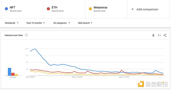 2022 年「NFT」、「ETH」、「Metaverse」相对搜索量全球统计,数据来源: Google Trends