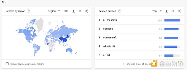 从 NFT 关键词(NFT、ETH、元宇宙)的谷歌搜索量变化中可以看到全球对 NFT 的关注度,左轴上的数字 100 表示该关键词的相对搜索量在某一地区和时间段内的最高点。