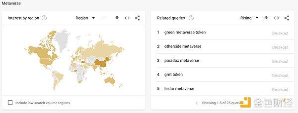 2022 年谷歌全球统计「Metaverse」相关热搜词,数据来源:Google Trends