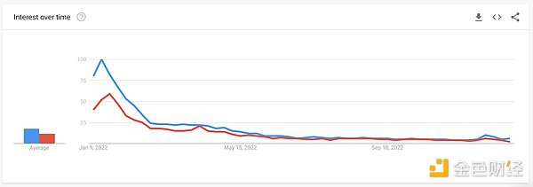 「购买 NFT」(蓝色)和「出售 NFT」(红色)的关键字兴趣趋势,数据来源:Google Trends