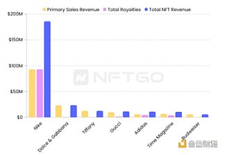 在所有 Web2 品牌和 NFT 结合的案例中,运动品牌表现最为亮眼,尤其是 Nike,在收购了 RTFKT Studios 后,其二级市场交易量已突破 100 亿美金,并产生了高达 1.85 亿美金的收入,其中包含 9313 万美金的一级市场收入和 9281 万美金的版税收入。在所有发售的品牌中,CloneX 系列交易量位居第一,其次是在 2022 年年初给 CloneX 持有者空投的 MNLTH。