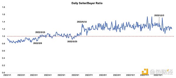 此外,在 2022 年 6 月中旬,交易者和买卖人数有了一个断崖式下跌,以每日的卖家数量 / 买家数量构建指数,该指数在 2022 年 3 月以前一直小于 1,即市场整体处于强买方力量阶段,而后在 3 月到 5 月初期间在 1 附近波动,并以 5 月下旬为拐点,开始卖方力量快速提升,之后指数持续高于 1,NFT 进入卖方市场。NFT 行业也自此进入深熊市、宏观市场持续下跌,致使持有者在等待观望市场态度和走向。值得注意的是,自 2022 年 12 月 5 日左右起,该指数出现趋势性下降、持续至年底,或预示着市场正在回暖。