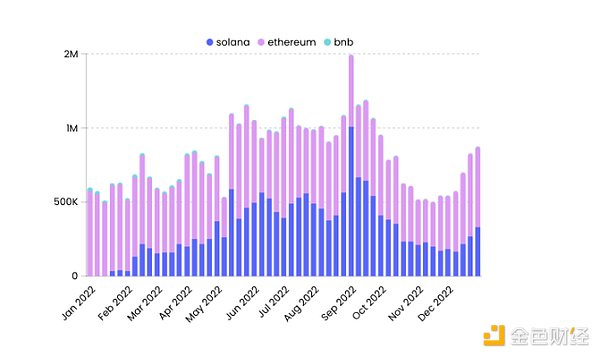 Solana 与 ETH NFT 交易量对比,数据来源: NFTGo.io