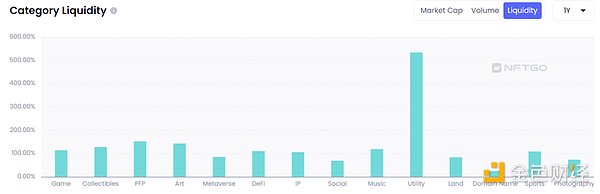 在去除掉清洗交易后进行计算,过去一年流动性最好的类别为实用 NFT(utility) ,流动性 533.74%;而流动性最差的为域名 NFT(Domain Name),仅为 25%。