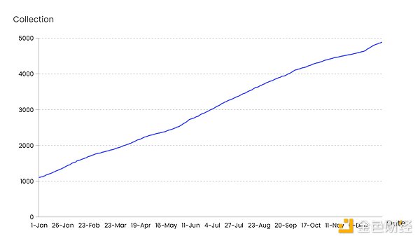 根据NFTGo.io的全球实时NFT市场数据,目前符合收录已经达到4,888个藏品和39,669,418个NFTs,以下均以“发行并达到NFTGo.io收录”标准进行统计分析,2022年度每月新发行的NFT项目约为315个,平均每日发行10个新项目,新增项目整体发展趋势呈平稳增长态势。即便在市场行情整体下行的背景下,NFT的发行数量的平均每月增速依旧可以维持在11.86%。