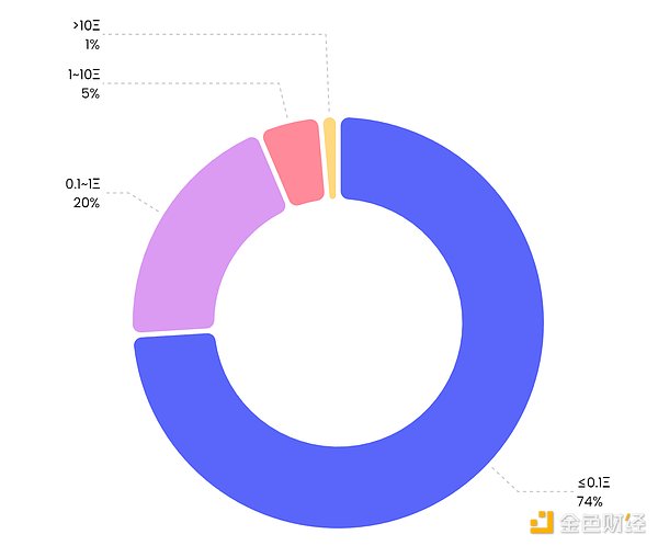 按照不等距区间进行统计,目前市场上Floor Price ≤ 0.1ETH的项目最多,占到总项目数的74%,其次0.1~1ETH占比20%,1~10ETH占比5%,而大于10ETH的项目仅占到总项目数的1%,整体NFT价格的分布呈现出“价格越贵、项目越少”的特点,而正是这些少量的高市值项目构成了NFT市场的主体。