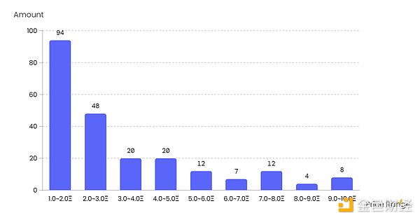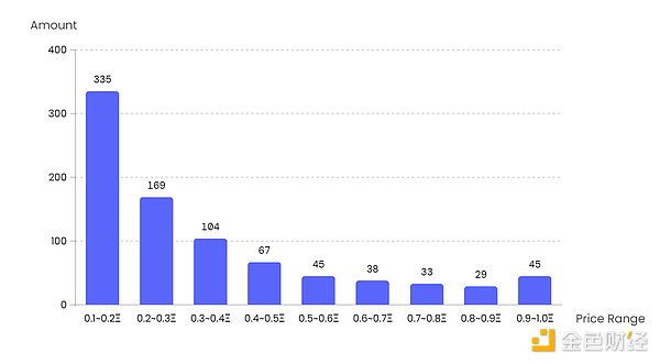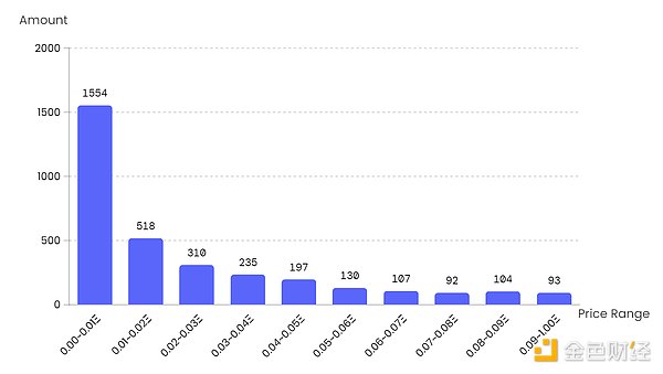 其中在0~0.1ETH以下的区间中,0~0.01ETH的项目占了47%,为1554个,其余价格区间价格依次减少并分布在尾部,再如:0.1~1ETH的NFT项目中,0.1~0.2ETH的项目最多,为335个;1~10ETH的NFT项目中,1~2ETH的项目最多,为94个。