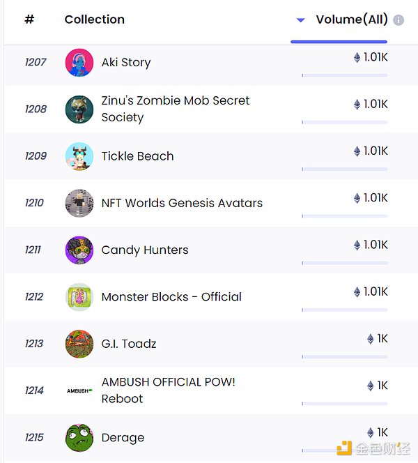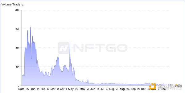 今年许多在市场上一时火热的项目,在发行后交易额很快会迅速站上1K ETH,这样的NFT项目在1~5月大量涌出。(据NFTGo.io收录截至目前共有超过1215个NFT项目交易量大于1K ETH。)