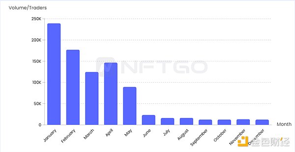 NFT流动性与市场的火热程度息息相关。我们将交易量、交易者的活动趋势进行计算,用于表现为流动性趋势,可以得出过去一年市场整体流动性最好的时期为1月份和4月份,进入5月则流动性开始大幅下降,9月份为今年流动性最为枯竭的时期。