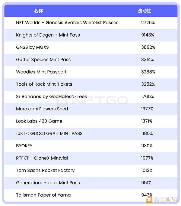 以下是流动性排名前15位的NFT项目,它们大多数以Mint Pass属性为特点,比较有趣的一点是,偏同质化的NFT的流动性会更好一些: