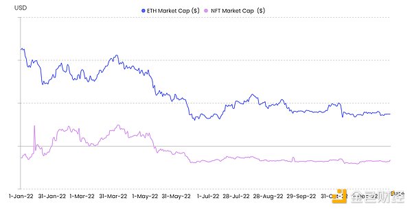 NFT市值和ETH市值趋势对比,数据来源:NFTGo.io