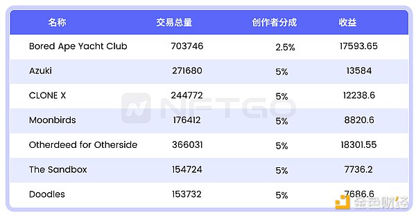 2022 年 8 月 26 日,X2Y2 宣布推出自定义版税功能,允许 NFT 买家在购买 NFT 时自主选择支付 100%、50% 或 0% 的对应比例版税,此举一出立即引起人们对于“版税”的讨论,许多NFT项目方表示版税是驱动项目发展的重要组成,让我们来看看头部的NFT项目方究竟通过版税赚了多少钱。截止12月30日Otherdeed已经通过版税获得了18K ETH的收益,按照12月30日的ETH价格,价值约为2196万美元,下图为一些项目方的版税收入,仅以OpenSea为参考: