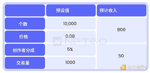 我们选取发行量10,000,发行价格0.08ETH、版税5%、交易额为1K ETH,进行粗略模拟计算