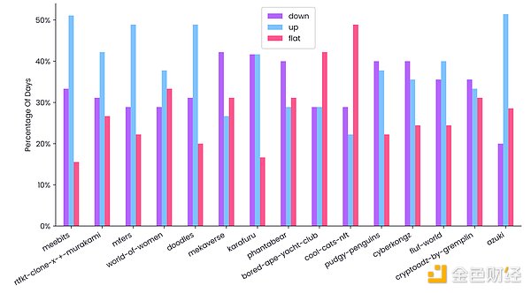 NFT的平均价格上涨、下跌和持平的天数百分比(5.1-5.15),数据来源: NFTGo.io