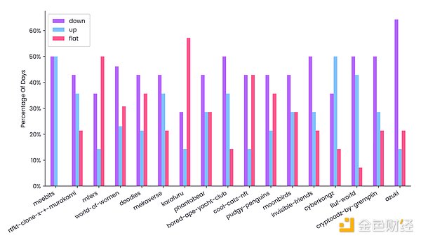 而在5月初到5月中旬阶段,NFT 市场也跟随数字市场进入一定的冷静期,与此同时价格下跌的天数比例较于前期牛市明显增多,上涨天数的比例越来越少,整体市场也开始处于下行区间,即使是头部NFT项目表现也会受到整体性市场情绪所把控,下跌天数比例也往往多于上涨天数。