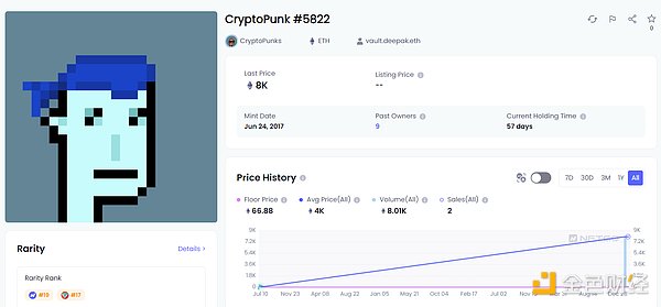 其中今年最高成交价由CryptoPunk #5822于2月创下,成交价格为8K ETH。