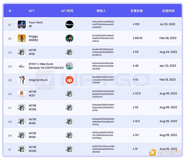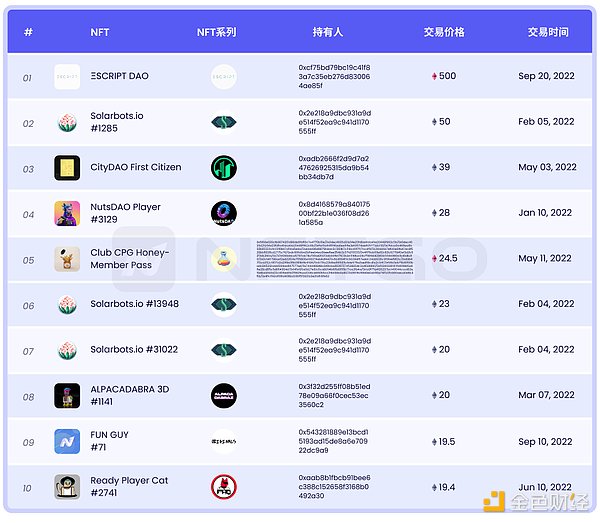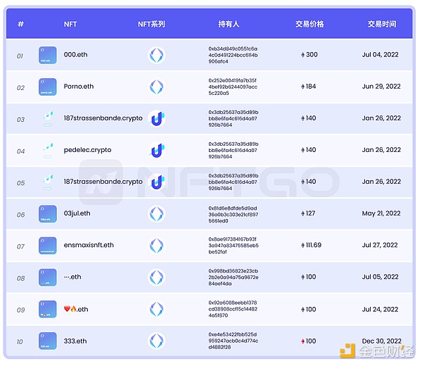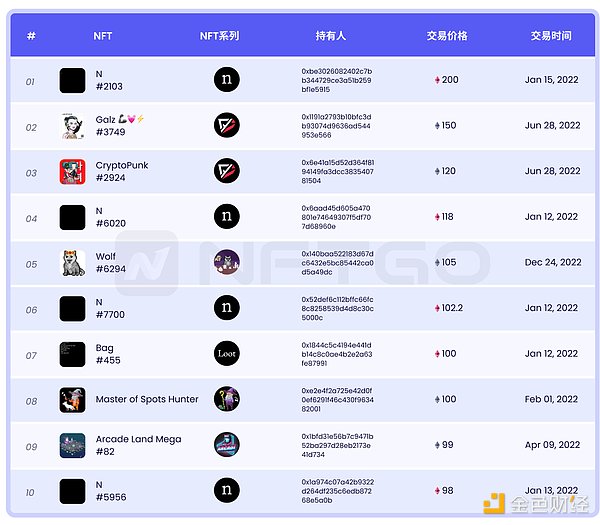 今年创下高价成交的NFT数量众多,前100名最高价格均成交在今年,它们的成交价均在250 ETH以上。