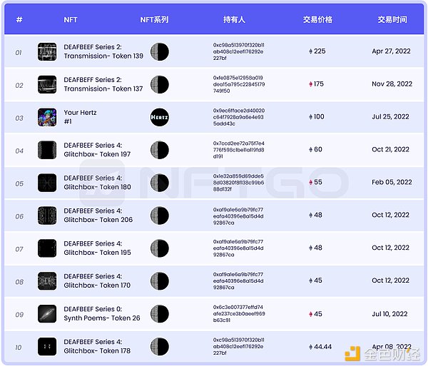 上表为具有有效交易量但价格异常高昂的NFT的项目,通过对比可以发现它们多具有一些共同性:首先是低挂单量和钱包分布度较低,意味着这些项目的少数持有人拥有较多数NFT,筹码分布较为集中。第二是项目一经发行便在高位价格进行交易换手,如下图在Deafbeef在发行之后便处于50ETH,目前的挂单率仅为3.59%。