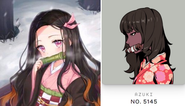 Azuki的美术风格主打日系风,几乎所有的动漫爱好者都能从Azuki NFT中找到自己喜爱角色的影子,如《攻壳机动队》中的草雉素子和《鬼灭之刃》的弥豆子等。