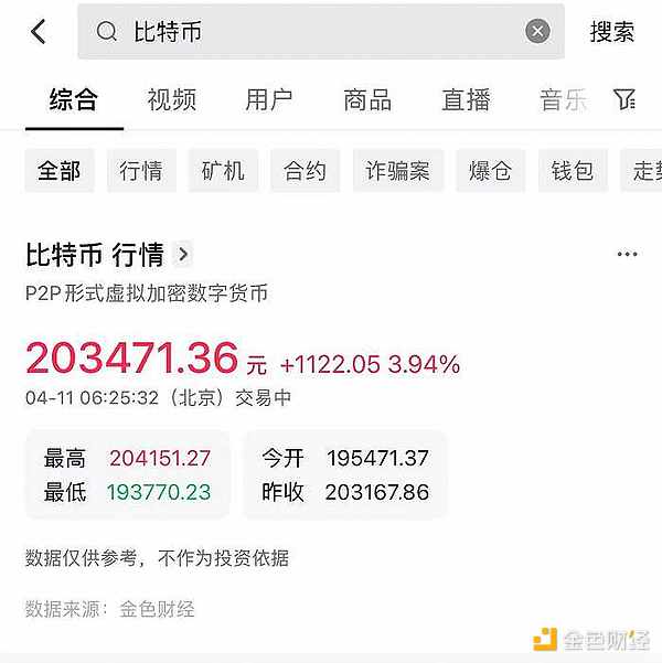 在中国大陆地区,据社区反映,国内最大短视频社交平台之一抖音APP的搜索引擎可以为比特币提供行情报价,界面新闻确认,在其APP内搜索“比特币”关键词,首条已出现当日、最高、最低、今开、昨收价格,比特币的标签为P2P形式虚拟加密数字货币,数据来源为金色财经。同时,输入加密货币币种名称+行情也可以获得行情数据。