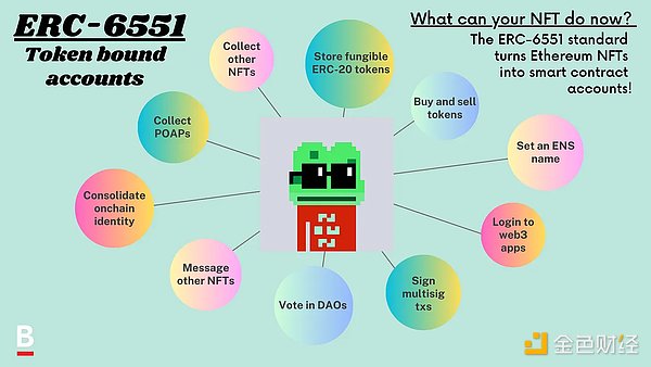 得益于 ERC-6551 标准,您现在可以用 ERC-721 NFT 做任何您可以用普通以太坊钱包做的事情。当然,基础知识是使用您的 NFT 存储其他 NFT、交易 ERC20 等。但这只是触及表面!