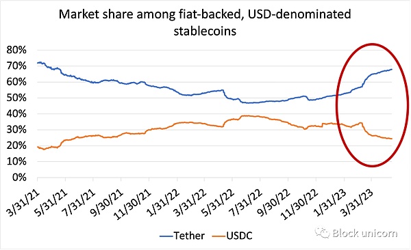 在三月份,对其资产簿的透明度导致负债(银行用户存款或是USDC体量越大,意味着负债越大,因为这些资金需要兑付给客户,所以是负债)流失,尽管最终没有面临任何损失,但这表明它是一家银行。而相对有更高风险,但巧妙地降低了透明度的Tether在三月份重新夺回了大量市场份额,所以它也是一家银行: