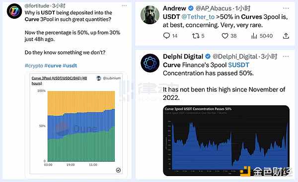 而在过去最近 48 小时里,Curve 3pool 中的 USDT 集中度上升至了 50%,又在仅仅一个小时内又从 50% 急剧上升到了 74%。这引发了社区的担忧,大家似乎都对 USDT 突如其来的抛压有些摸不着头脑。难道是有人提前知道了一些关键信息?毕竟上一次 Curve 3pool 中的 USDT 集中度超过 50%,是在 2022 年 11 月 FTX 崩盘之时,自那之后 USDT 集中度就再未达到如此高的程度了。