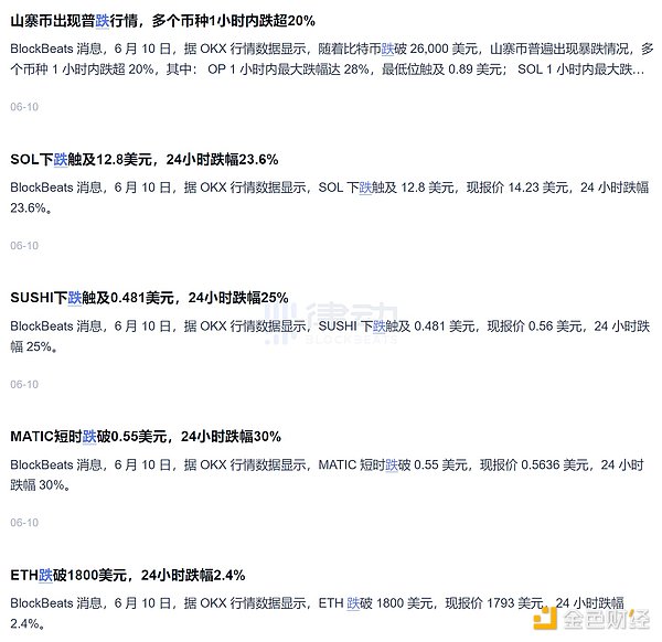 今日 USDT 的抛压不禁让我们联想起近一个月来市场流动性的迅速枯竭。近期,市场的表现很差,似乎进入了流动性匮乏的局面。尤其是 6 月 10 日的「15 分钟暴跌」事件,山寨币普遍跌幅超 20%,主流币种也出现相应幅度下跌。值得注意的是,彼时市场还没有遭到 SEC 监管出击的影响。而关于「15 分钟暴跌」原因的猜测,市场上也出现了 Jump Trading 和与 DWF 正在撤走流动性并退市的传言。