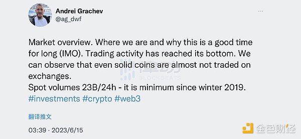 实际上,这种猜测并非空穴来风。今日,DWF Labs 管理合伙人 Andrei Grachev 发推称,目前市场 24 小时现货交易额已降至 230 亿美元,创下自 2019 年冬季以来的最低值。他透露,交易平台开始对项目的交易额和流动性等进行要求,否则将会将其下架。散户活动也相对较低,但对于那些想要投机、赚钱或者赔钱的人来说,他们仍然需要一些东西来满足需求。即使是市值较大的币种,在 24 小时内也可能出现 20-30% 的价格波动。