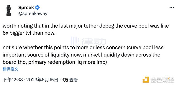 Spreek 指出,值得注意的是,在上一次 Tether 的脱钩事件中,Curve 的资金池规模比现在大了大约 6 倍。还有人认为,在赎回之前,通常会首先消耗次级流动性,这是因为赎回费用为 10 个基点。这一次,次级流动性的耗尽所需的资金流出比上次要少。通过观察当价格达到赎回价格时的交易量,可以了解人们对此的关注程度。如果有很多交易量低于赎回价格进行交易,那就表示人们更加关注。