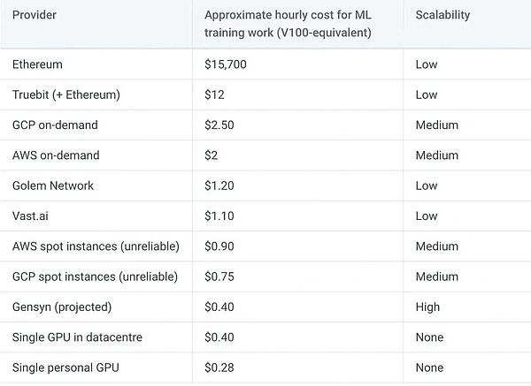 Gensyn系统会利用未充分利用和未优化计算设备资源。这些设备包括从目前未使用的游戏GPU到之前以太坊PoW时代的GPU矿机。因为该协议是去中心化的,意味着它最终将由社区多数管理,未经社区同意不能“关闭”,与web2不同,这使其具有抗审查性。该协议的创新点在于充分利用未使用的计算设备资源,为社区提供更多的计算力,同时也为那些拥有未使用设备的人提供了一个新的收入来源。并且Gensyn协议提供了与数据中心拥有的GPU相似的成本,其规模可以超过AWS。