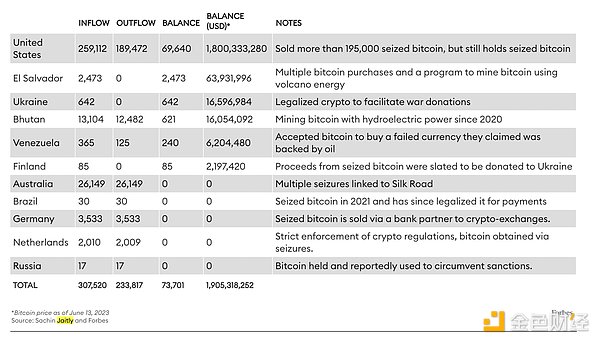 根据区块链分析公司 Elementus 的数据,该表显示了从 2013 年到 2022 年 11 个国家的比特币流量。大多数资产来自政府没收,信息不全面。