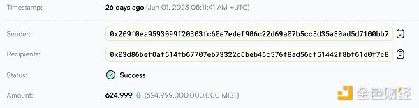 9/12 5 月 31 日,0x341f 开头地址向 0x209f 开头地址发送 250 万枚 SUI。然后,0x209f 开头地址将 62.5 万枚 SUI 发送到 3 个不同的地址,所有这些地址最终都被转入了币安,但为了简单起见,我们将只跟踪发送到 0x03d8 的 62.5 万枚 SUI。