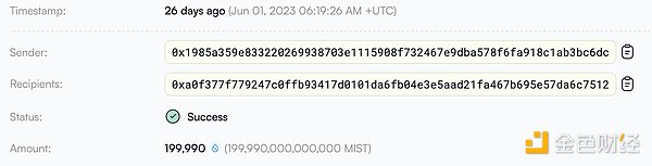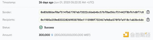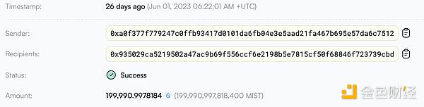 0x03d8 再次进行了拆分,将 30 万枚 SUI 发送到 0x1985。0x1985 在不同的 txns 中将大部分发送到 0xa0f3。最后 0xa0f3 发送到 0x9350,这显然是一个交易平台热钱包。我通过自己充值 / 提现 SUI 验证了这是币安的钱包。
