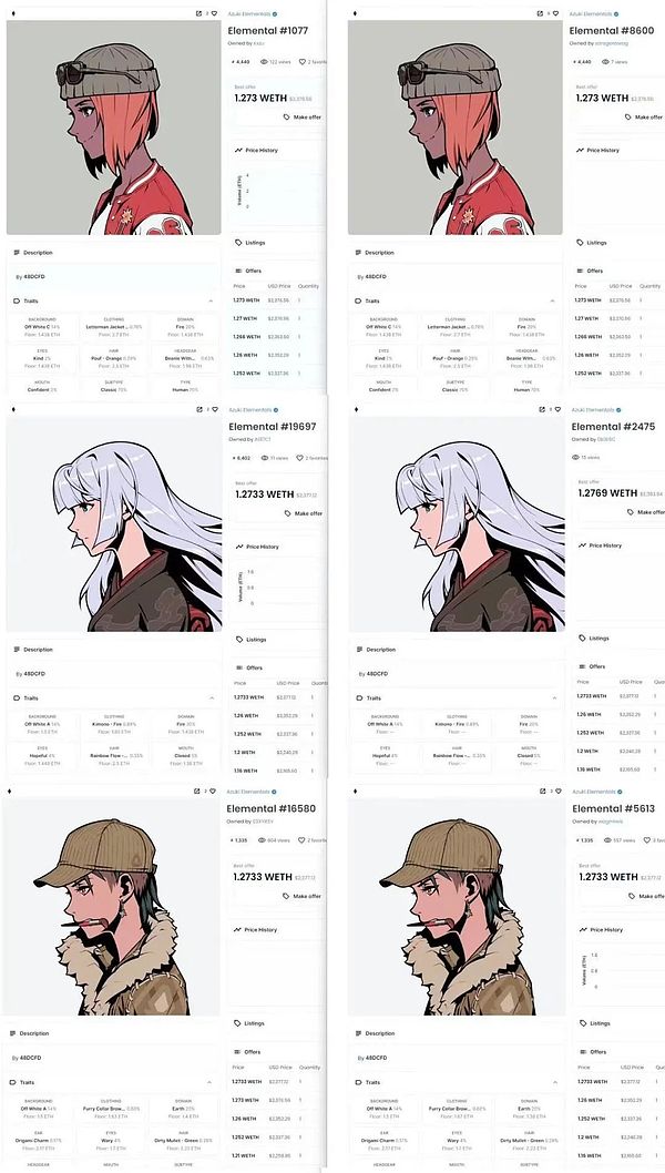 相比于Azuki受人喜爱的美术与造型,Azuki Elementals呈现的PFP图像出现了不少瑕疵:人物嘴巴移位,莫名其妙的黑色像素块等,加上与Azuki非常相近的风格,让参与铸造Azuki Elementals的玩家感受不到Azuki的任何诚意。相反,Azuki Elementals被认为是Azuki的变相增发,降低了Azuki的需求,因此Azuki社区开始抛售Azuki。