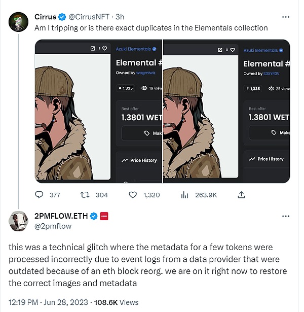 Azuki Elementals出现多个NFT存储了相同的元数据,导致Elementals持有者开图后发现自己的Azuki Elementals NFT与他人的NFT除了id号外完全相同。尽管Azuki联合创始人2PMFLOW回应这是因为数据提供商的事件日志因以太坊区块重组而失效,后续将重新上传元数据,Azuki NFT玩家已失去对项目方的信任。因为这种做法挑战了普通NFT玩家对于NFT所有权和去中心化的认知,是不被社区所接受的。