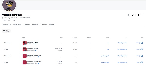 根据链上数据显示,在Azuki、Beanz、Elemental等价格都在下跌时候,麻吉大哥machibigbrother.eth却在逆市买入Azuki系列NFT。